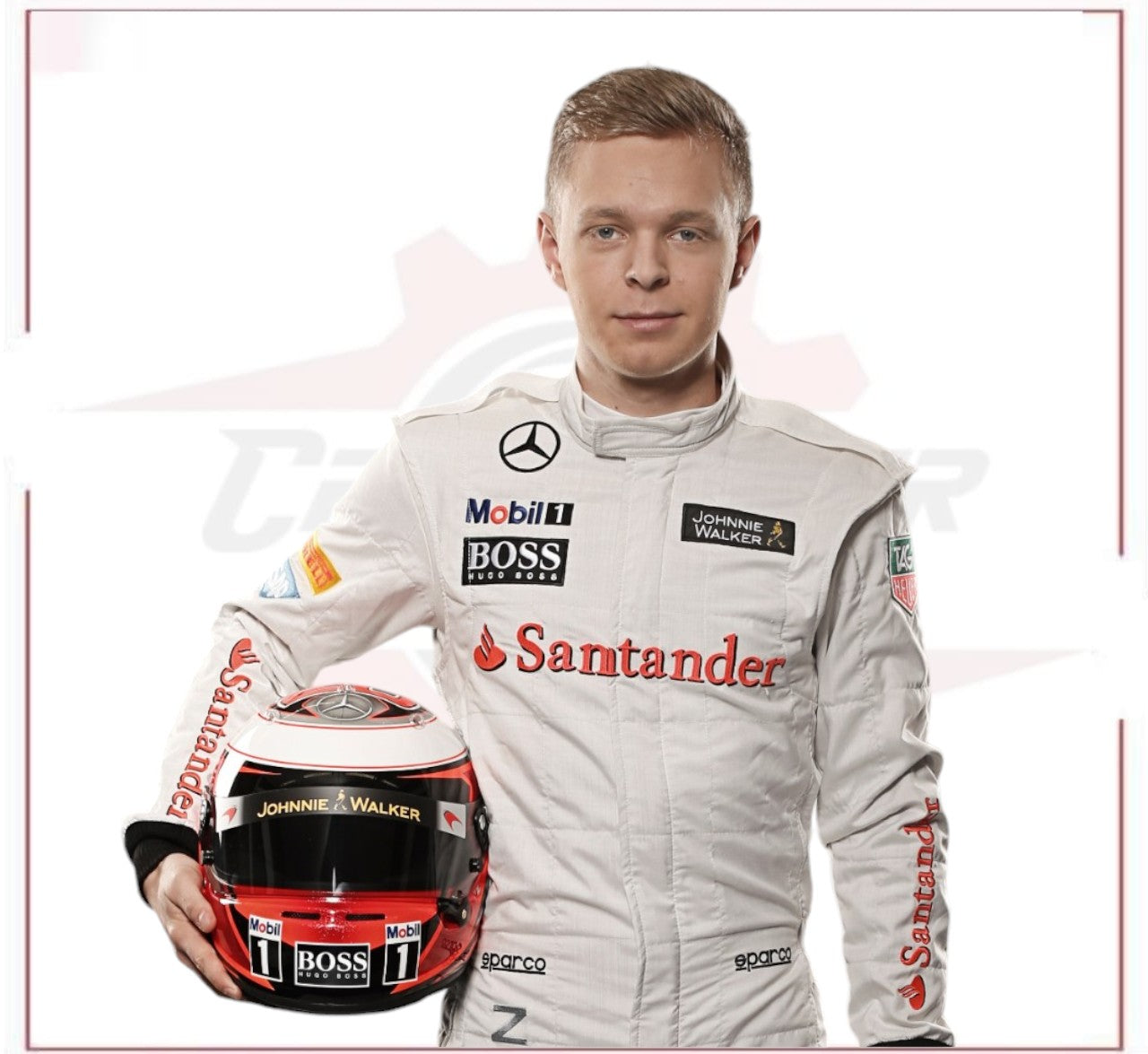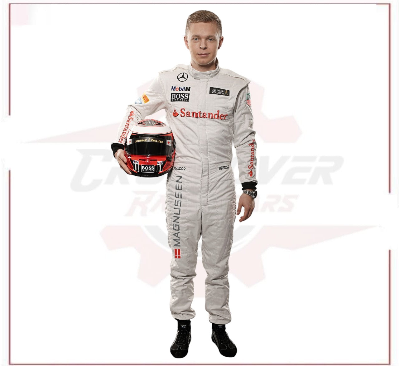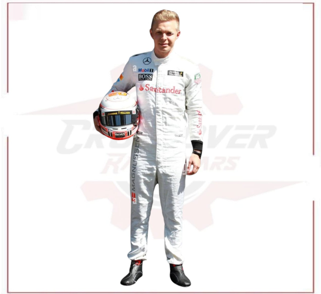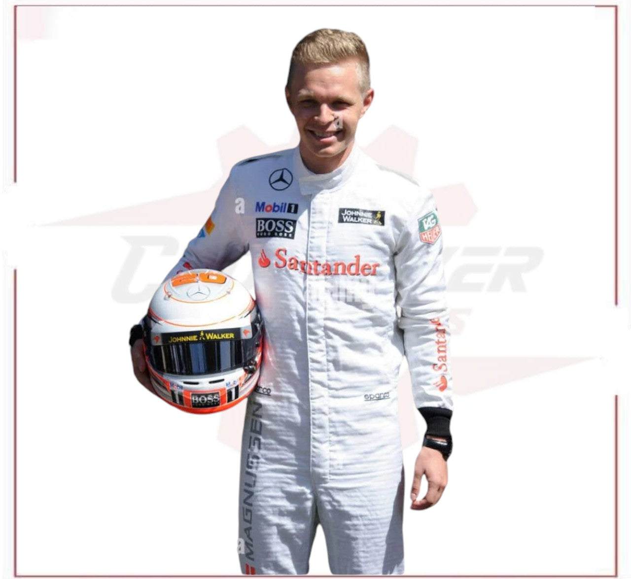 This 2014 Kevin Magnussen Team F1 Race Suit was designed for optimal performance at the Australian Grand Prix. Constructed with top-of-the-line materials, it offers lightweight comfort and maximum flexibility for the driver. With its sleek design and advanced technology, this suit is a must-have for any serious racing enthusiast. Kevin Magnussen New F1 Race Suit.