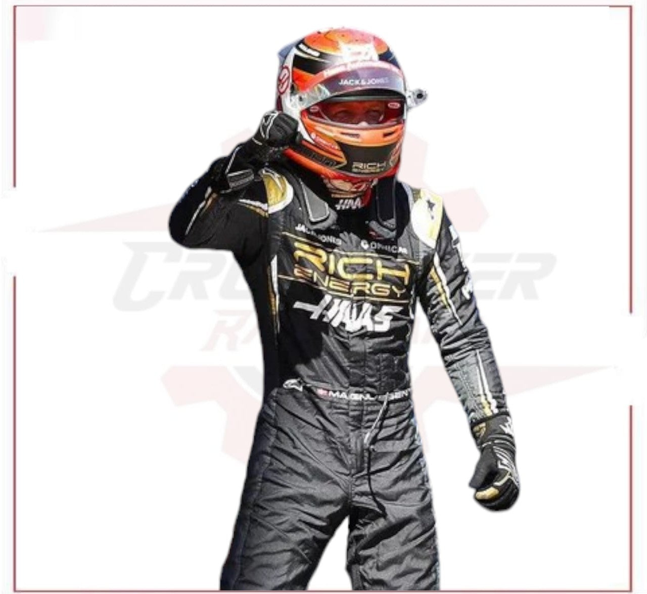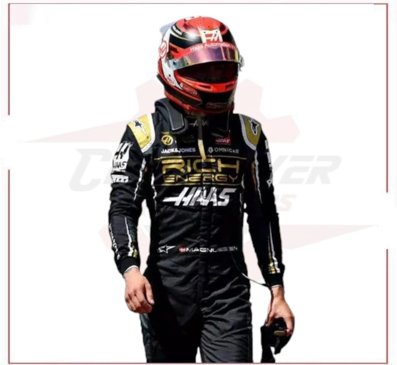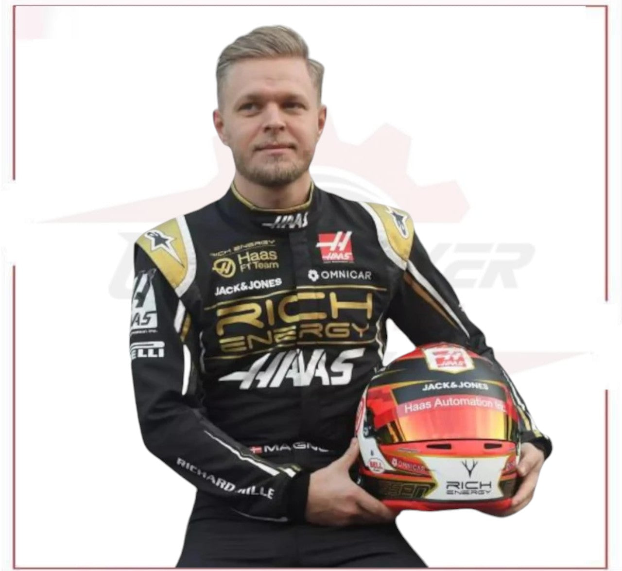 Experience the state-of-the-art technology and design of the 2019 Kevin Magnussen Haas F1 Race Suit. Crafted using expertly engineered materials and specially-developed aerodynamic designs, this race suit is F1-ready and provides the highest levels of performance and comfort. New Kevin Magnussen Haas F1 Team Race Suit.