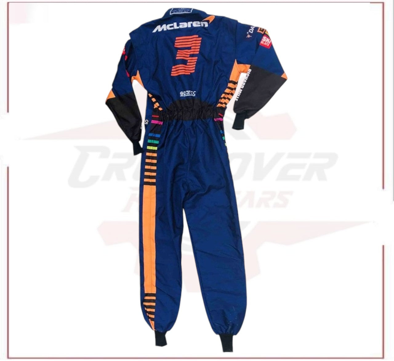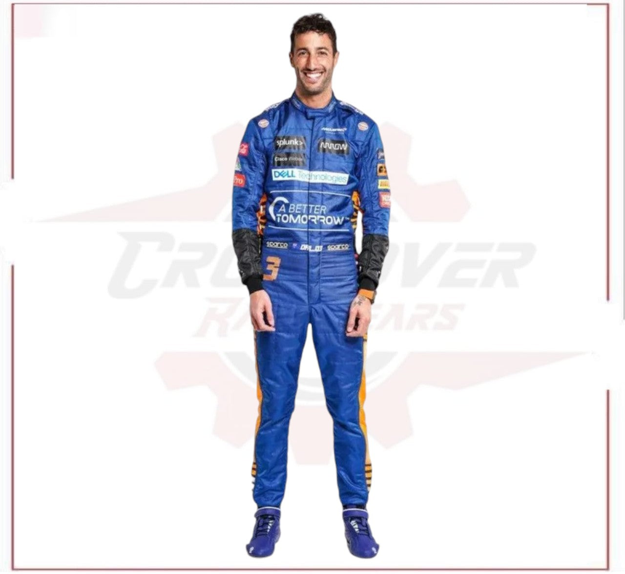 Manufactured by Crossover Racewears 2021 New Daniel Ricciardo | F1 Replica Race Suit CIK-FIA Level 2 approved Suit which is made of High Quality Shine Nylon Fabric with cotton towel lining, with all Sublimation logo, Heavy duty zippers, stylish design with racing strips on front, Action back stretchable material on back & sleeves for more comfortable during race drive.