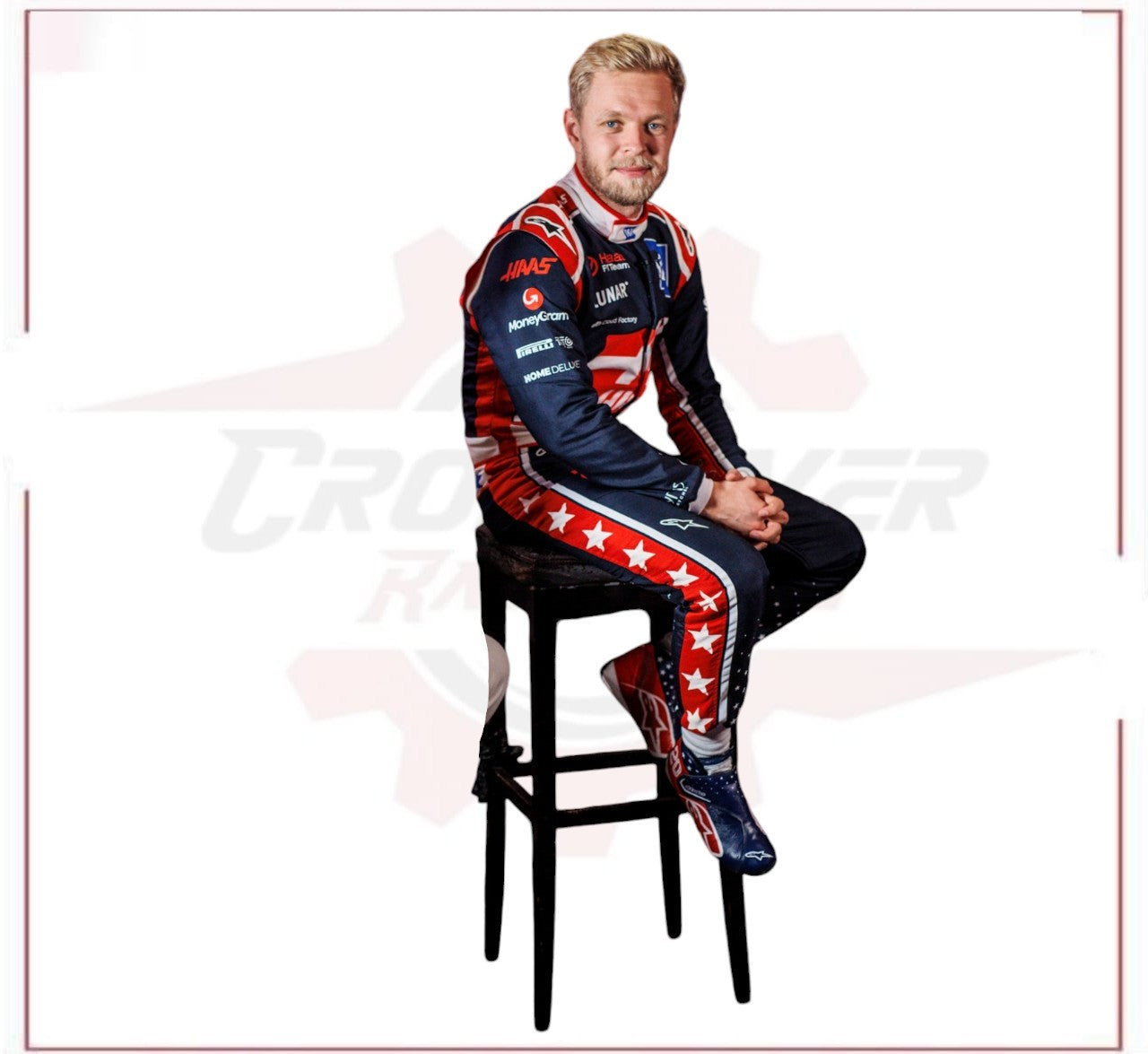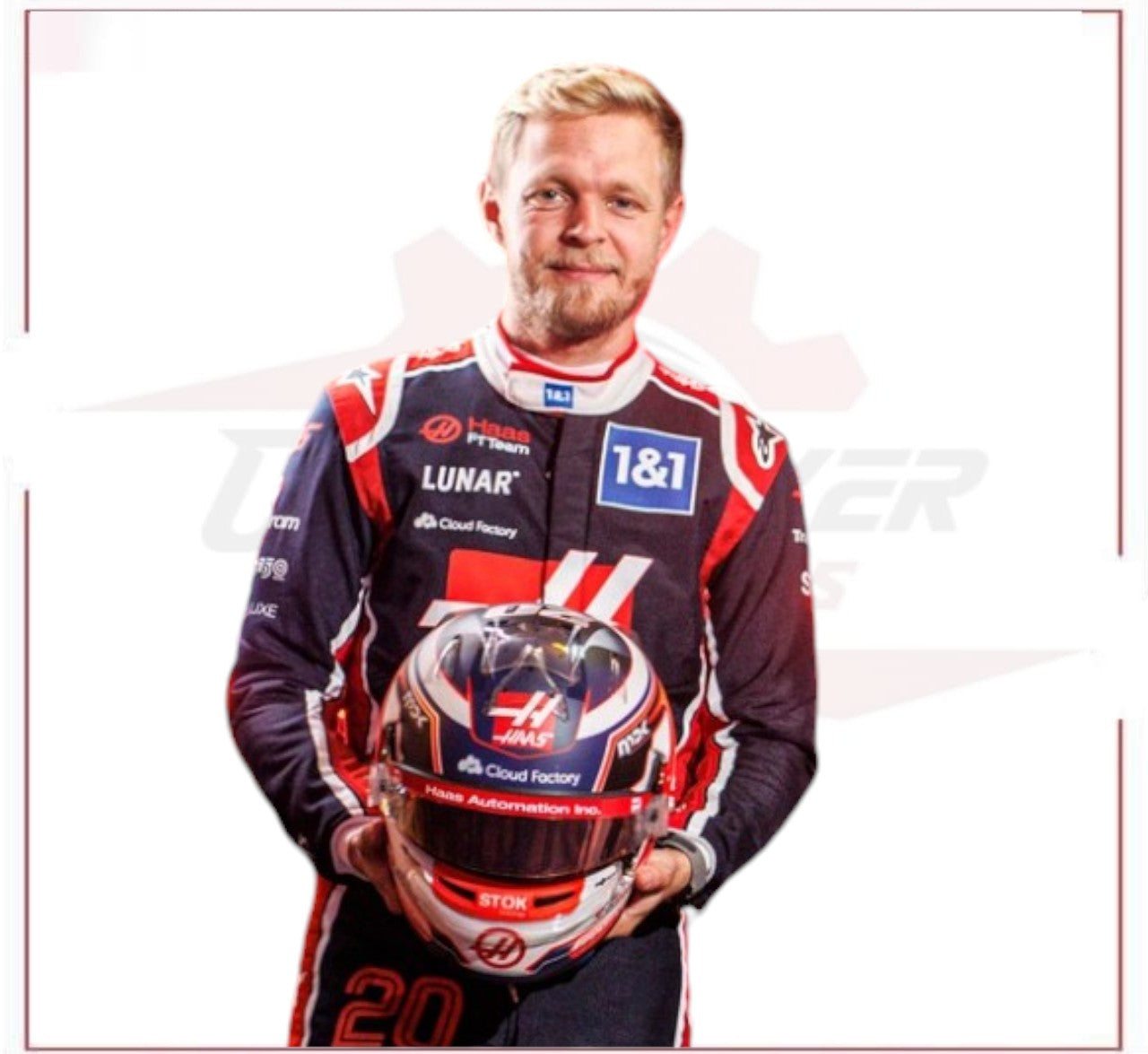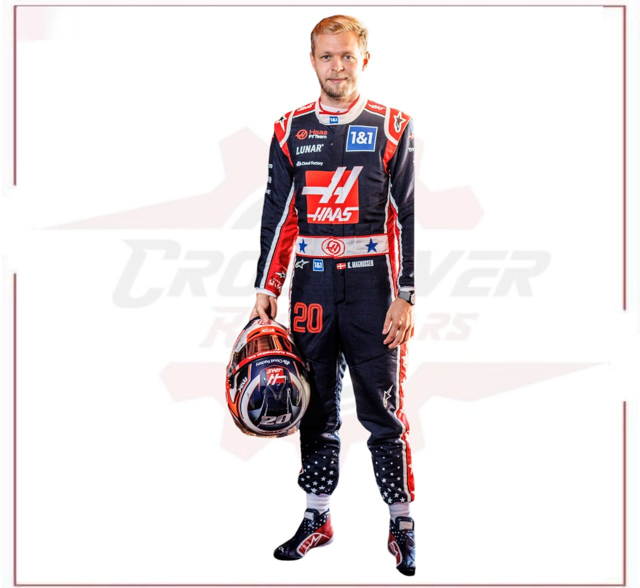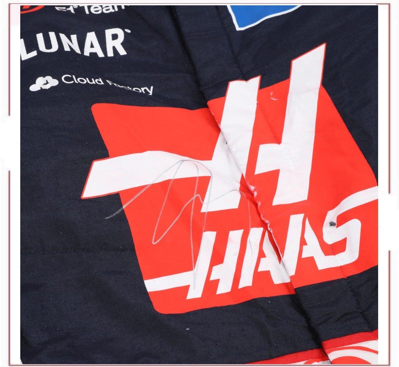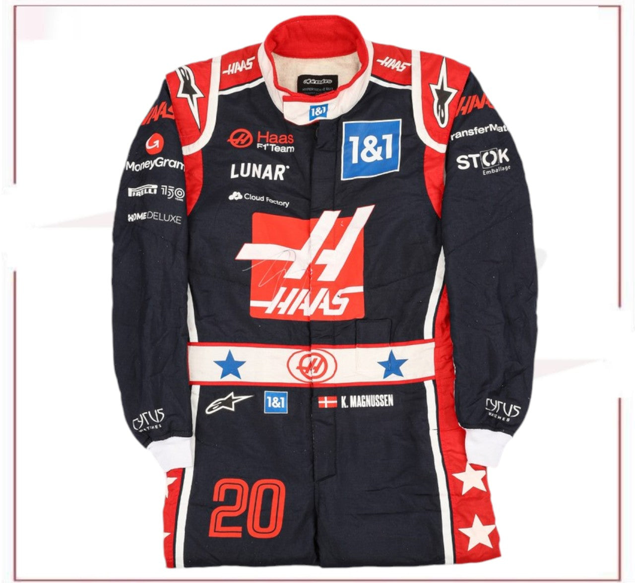 Celebrate Haas F1 Team's, Kevin Magnussen, with this official race suit, worn by the driver during the 2022 United States Grand Prix race weekend, which has been signed by the man himself. Kevin Magnussen 2022 Signed Official Race Weekend Used Suit US GP, Official licensed race suit Signed by Kevin Magnussen Race weekend used US GP special livery Kevin Magnussen Haas F1 Team's home race 2022 Haas liveries Professionally framed.
