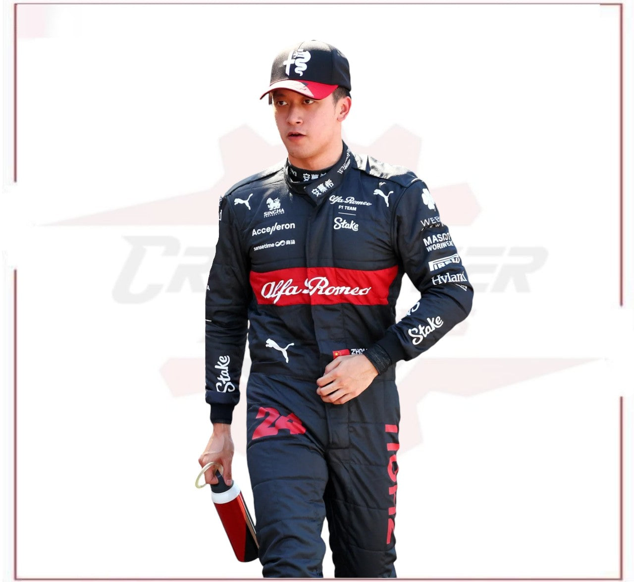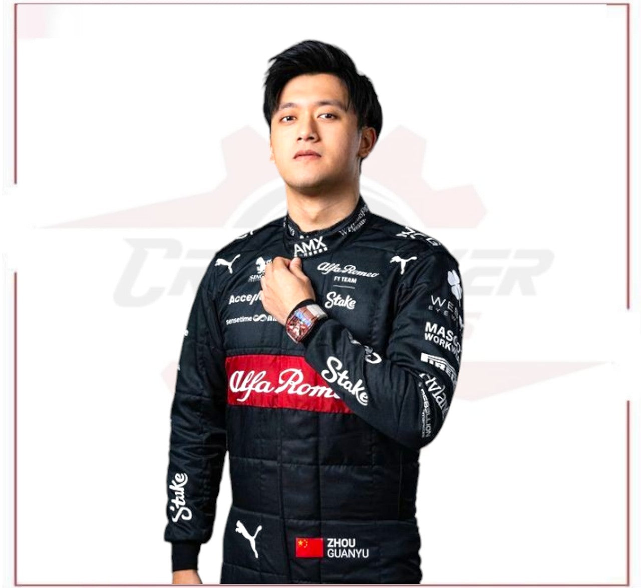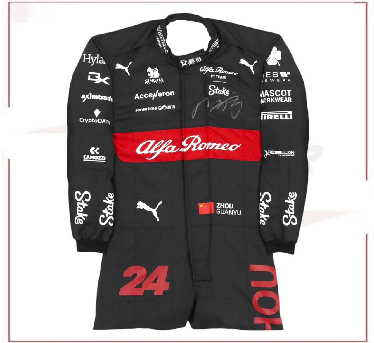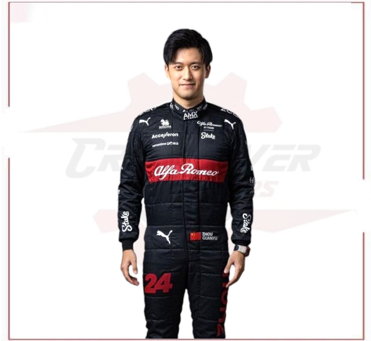 This authentic 2023 Zhou Guanyu replica race suit captures the look and feel of the official Alfa Romeo F1 Team Stake suit. Crafted from durable Shine Cordura fabric with a soft cotton lining, it offers both style and comfort. Detailed with team colors, Alfa Romeo, Stake sponsor logos, and other official branding, this suit brings an accurate representation of Zhou’s race-day gear. Available in all sizes, it includes complimentary personalization options—add your name and national flag at no extra cost. Each suit is quality-checked before shipping, making it a perfect choice for dedicated fans and collectors alike.