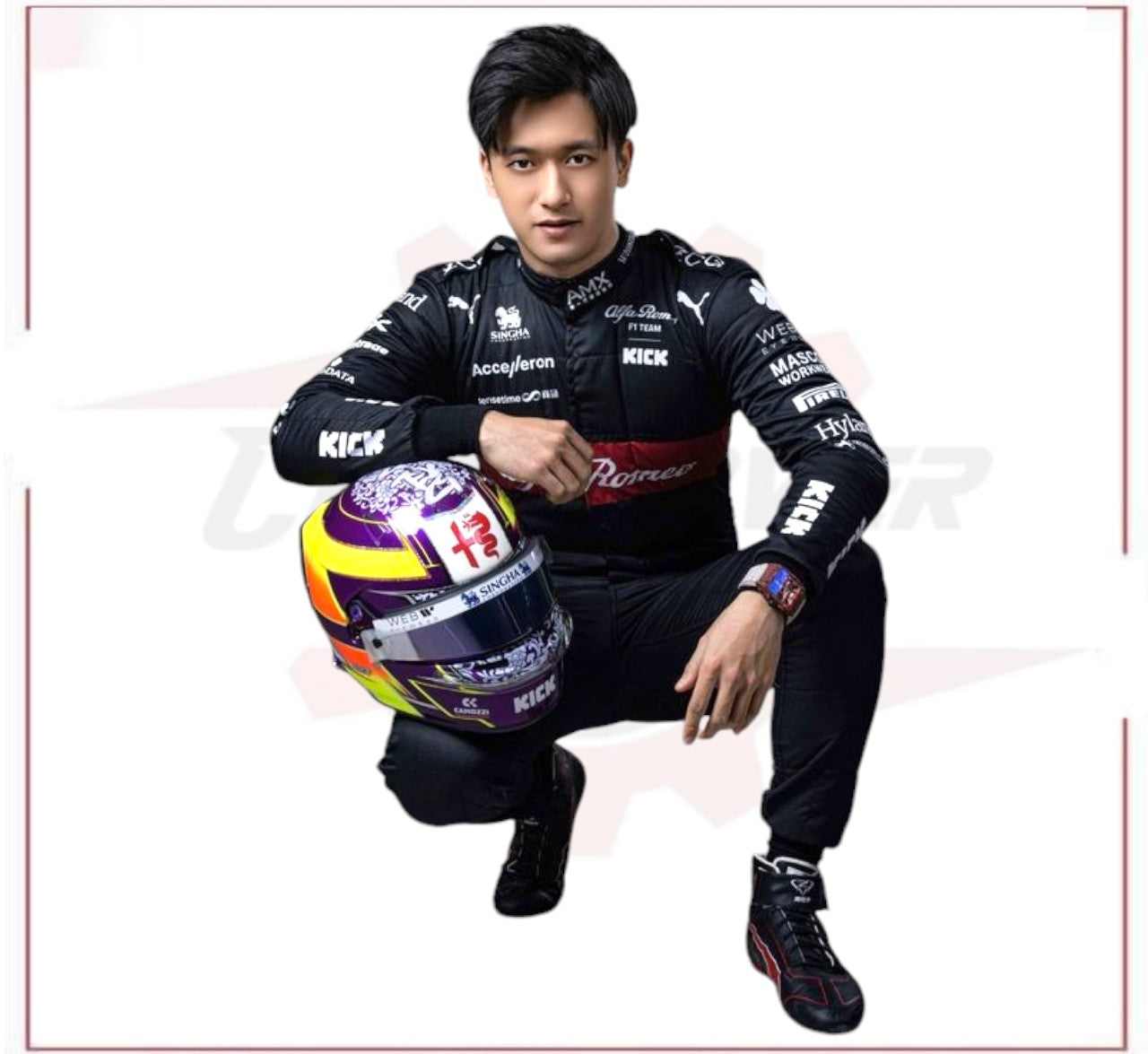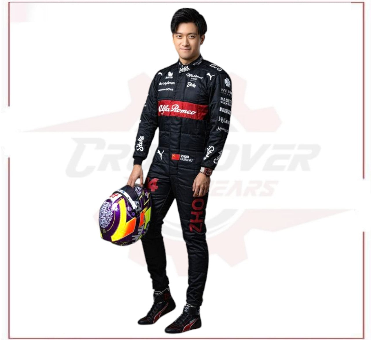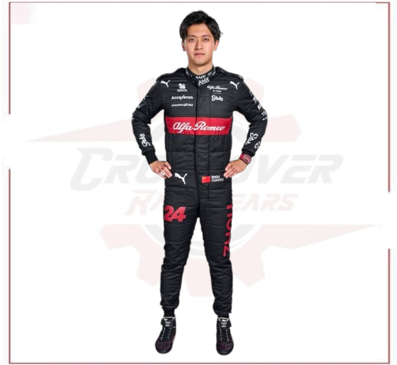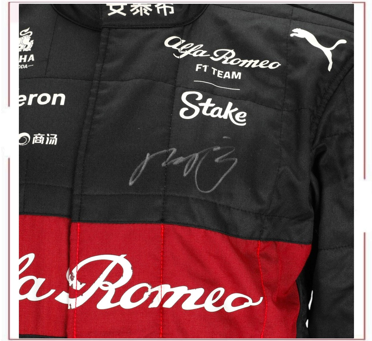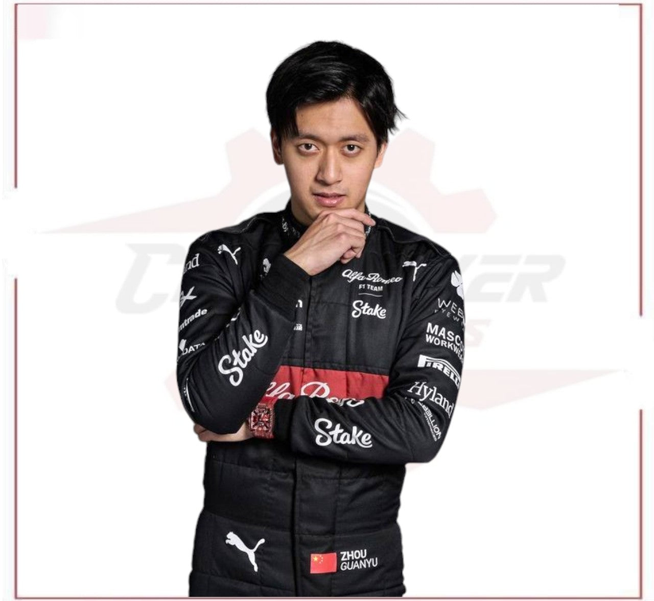 This authentic 2023 Zhou Guanyu replica race suit captures the look and feel of the official Alfa Romeo F1 Team Stake suit. Crafted from durable Shine Cordura fabric with a soft cotton lining, it offers both style and comfort. Detailed with team colors, Alfa Romeo, Stake sponsor logos, and other official branding, this suit brings an accurate representation of Zhou’s race-day gear. Available in all sizes, it includes complimentary personalization options—add your name and national flag at no extra cost. Each suit is quality-checked before shipping, making it a perfect choice for dedicated fans and collectors alike.
