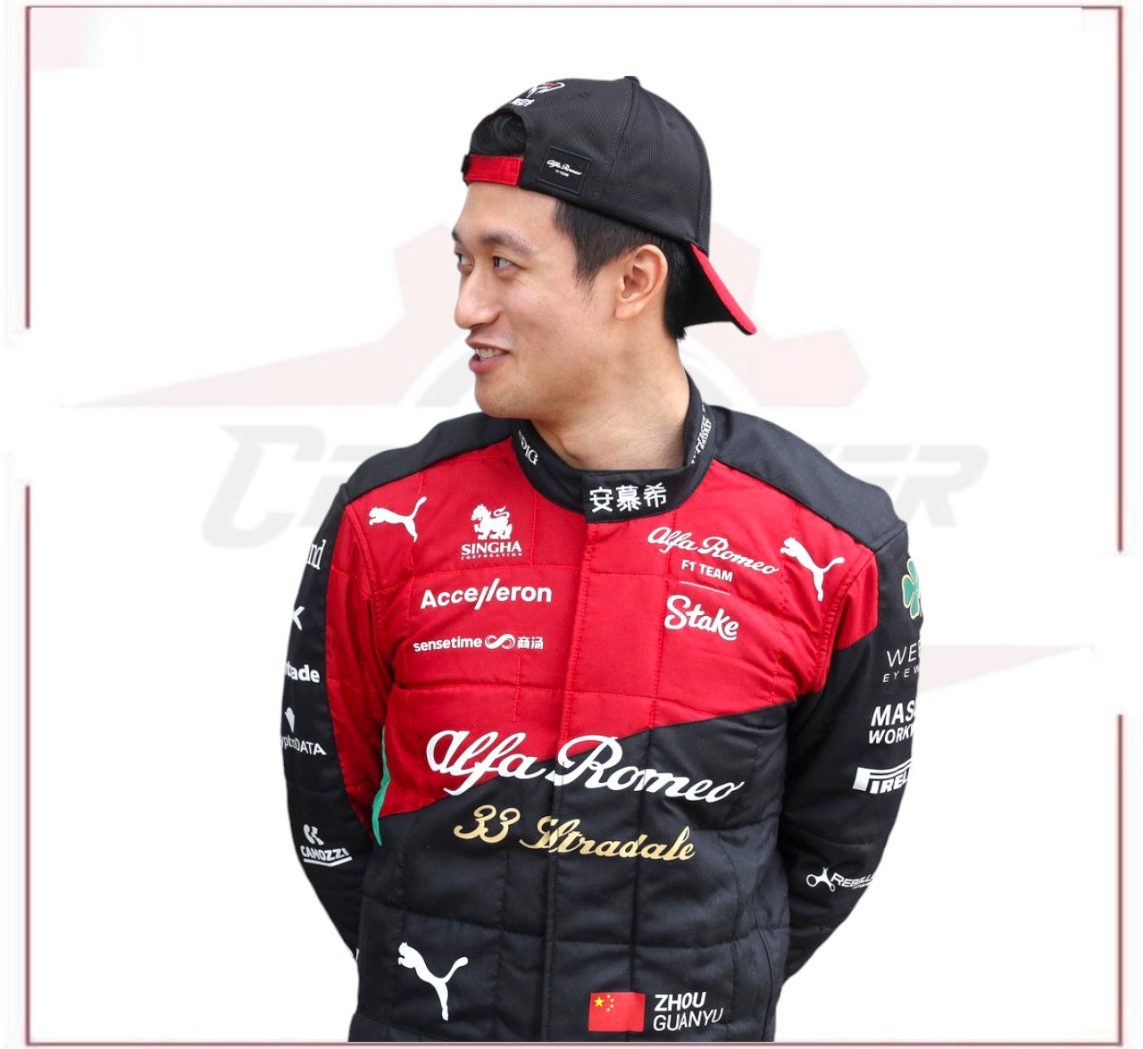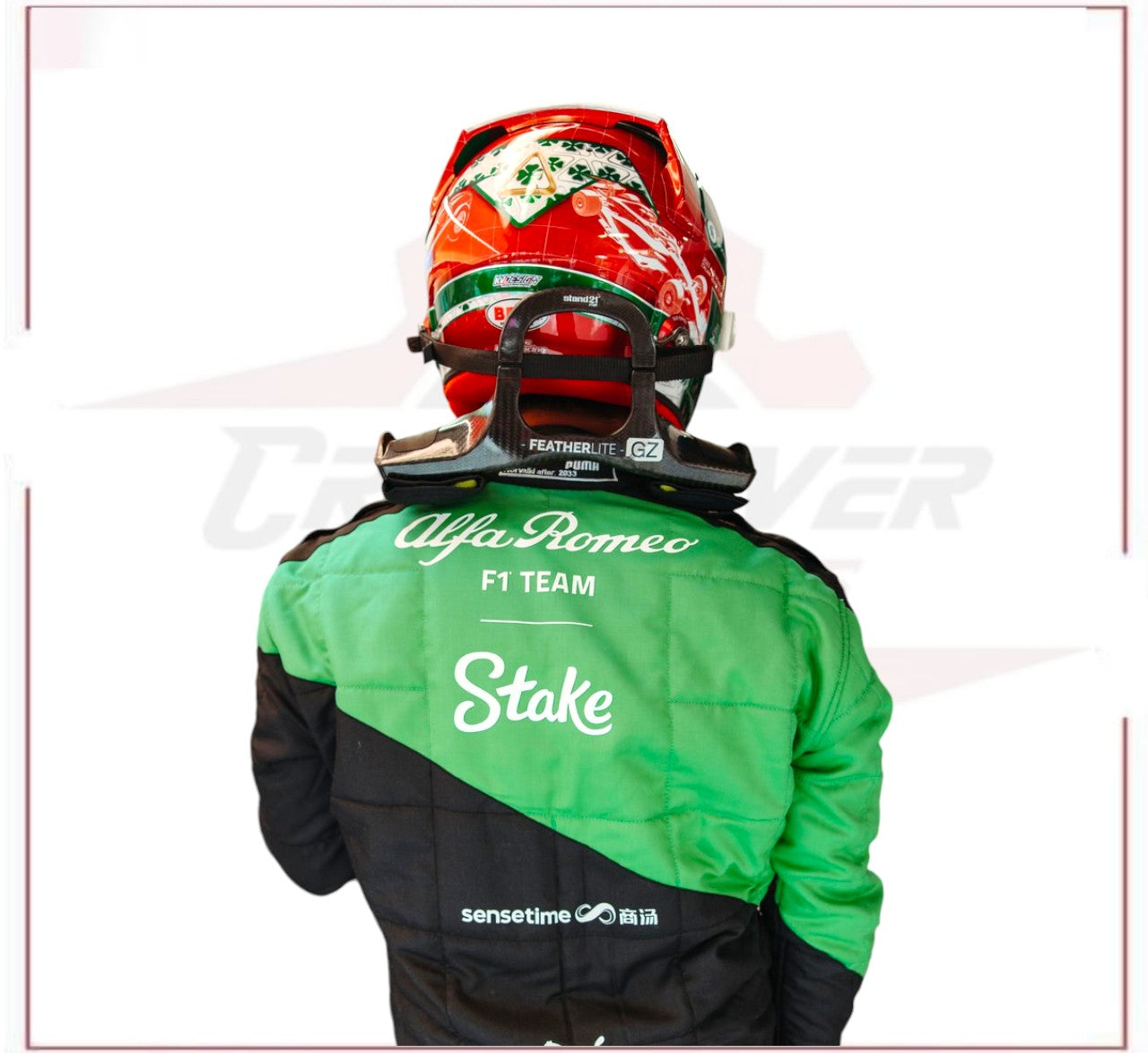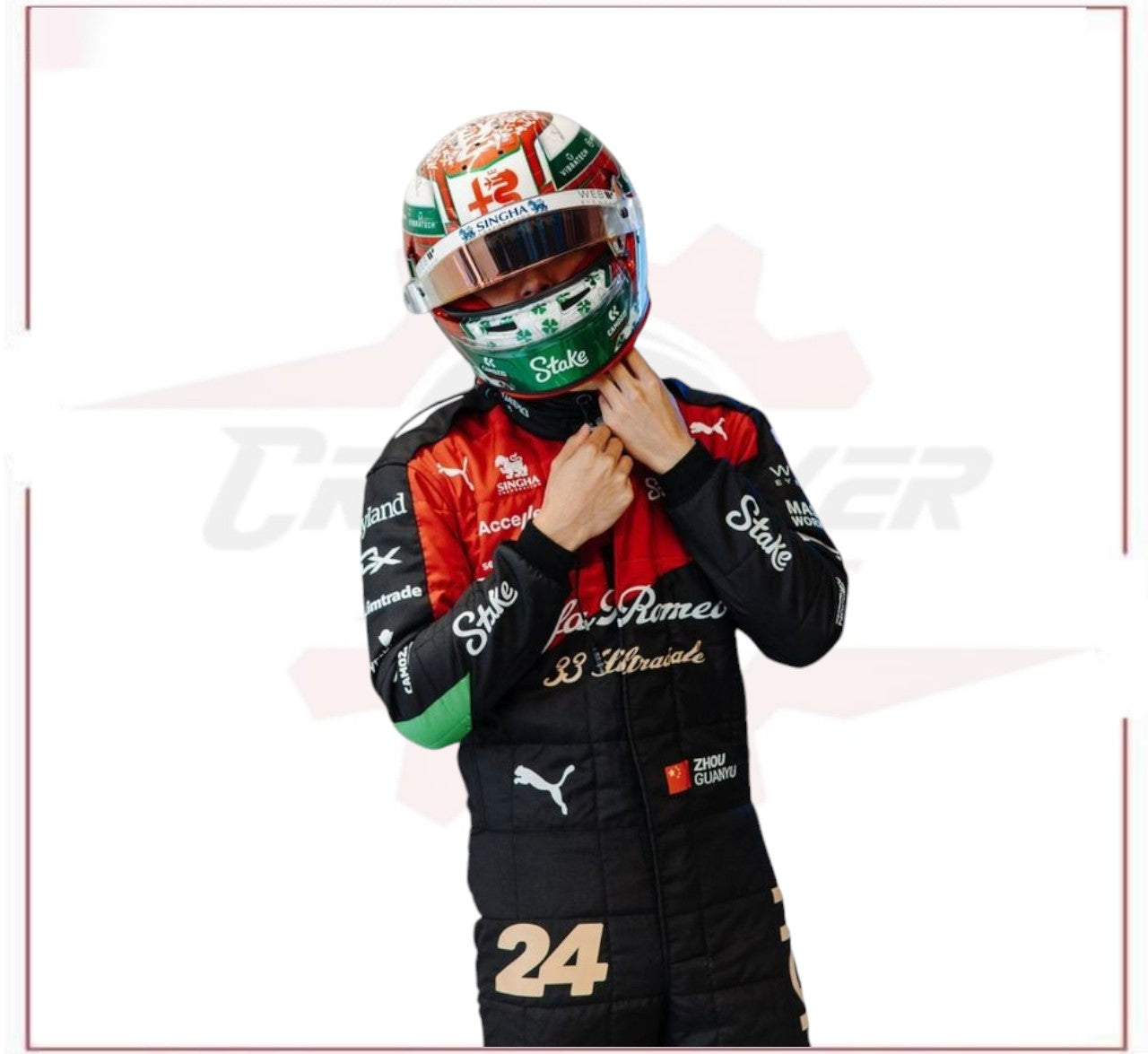A high-quality replica of the suit worn by Zhou Guanyu at the 2023 Italian Grand Prix, this suit Alfa Romeo F1 Team’s Race Suit Italian GP style. Featuring team colors, Stake sponsor logos, and Italian GP-specific detailing, it offers fans an authentic look. Constructed from durable Shine Cordura fabric with a soft cotton lining, this suit is as comfortable as it is striking. Available in all sizes and offering complimentary personalization for adding your name and national flag, each suit undergoes strict pre-shipment quality inspection,