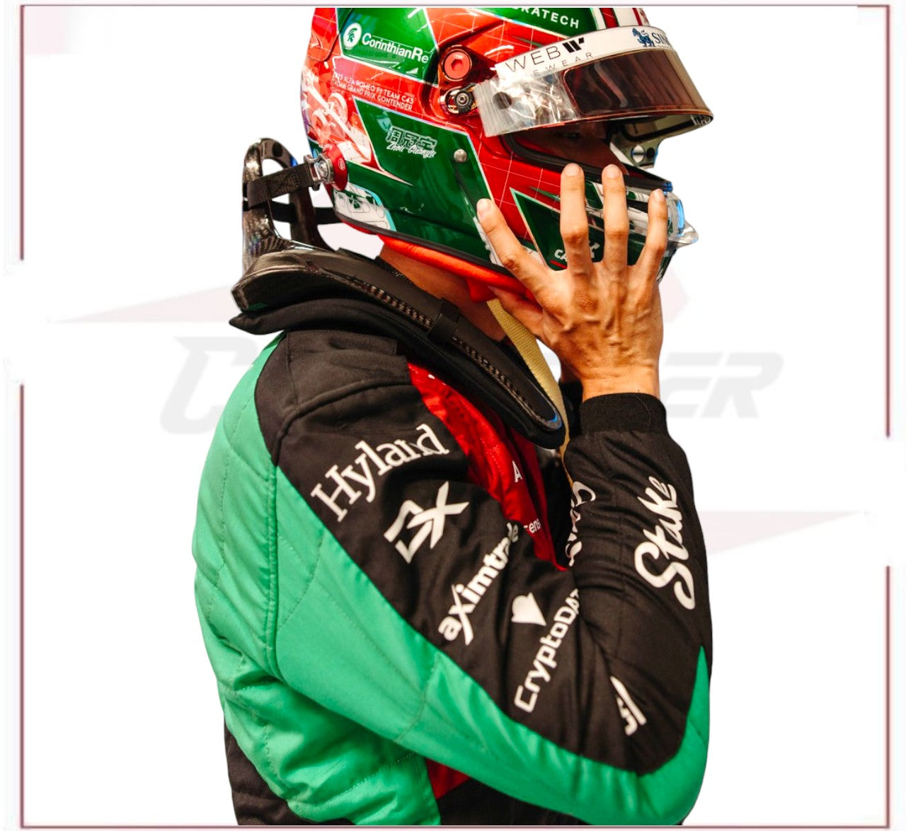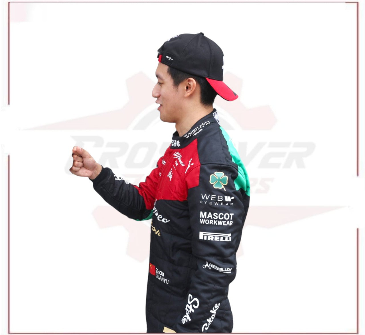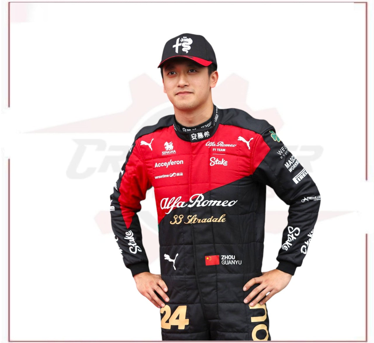 A high-quality replica of the suit worn by Zhou Guanyu at the 2023 Italian Grand Prix, this suit Alfa Romeo F1 Team’s Race Suit Italian GP style. Featuring team colors, Stake sponsor logos, and Italian GP-specific detailing, it offers fans an authentic look. Constructed from durable Shine Cordura fabric with a soft cotton lining, this suit is as comfortable as it is striking. Available in all sizes and offering complimentary personalization for adding your name and national flag, each suit undergoes strict pre-shipment quality inspection,