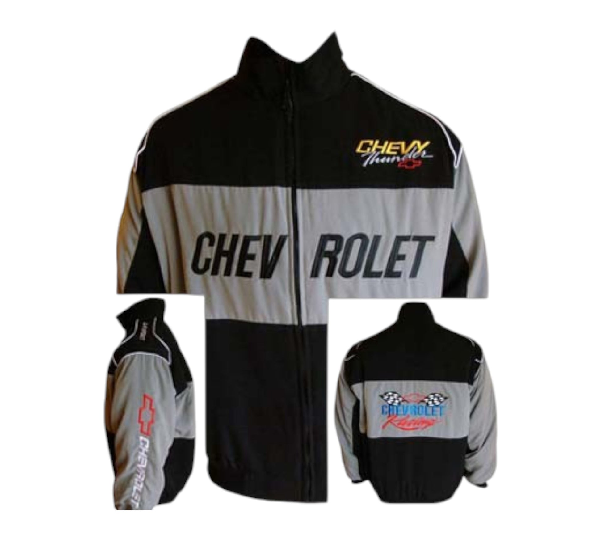 All Chevrolet racing jackets are made of a very soft and durable micro-fiber blend fabric Chevrolet Racing Jackets can be customized by adding Sublimation Printed or changing jacket colors. Have your name , number or logo directly into the jacket. Great Looking Chevrolet Racing Jacket Chevy Thunder Black & Gery is designed with the performance and style of the Chevrolet in mind. Made with high-quality materials, this jacket is perfect for any racing enthusiast. With its sleek and modern design, it's the perfect addition to any racing wardrobe. Top quality custom racing apparel, Chevrolet Vintage Racing Jackets.