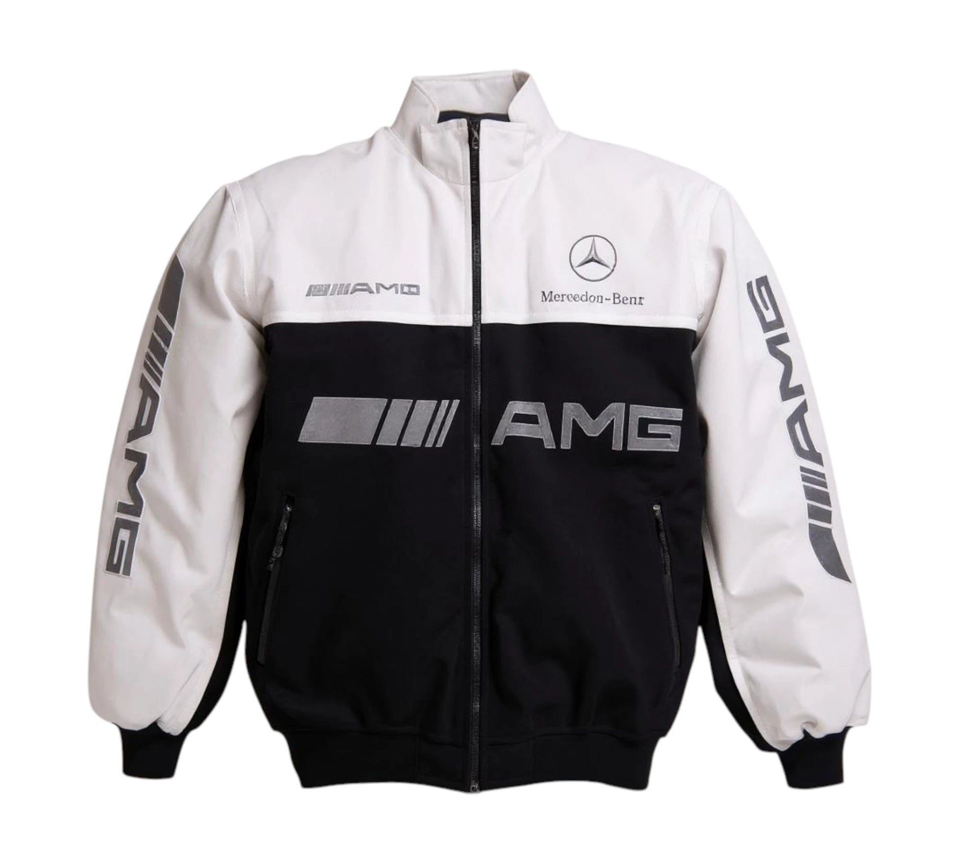 The Mercedes Benz AMG Racing Vintage Jacket in White & Black features high-quality sublimation printing that ensures vibrant, long-lasting colors and intricate detailing. Designed for enthusiasts who appreciate both style and performance heritage, this jacket combines classic racing aesthetics with modern durability. Its lightweight fabric offers comfort and protection, making it ideal for everyday wear or motorsport events. Show your passion for AMG racing with a jacket that reflects authenticity and expert craftsmanship.