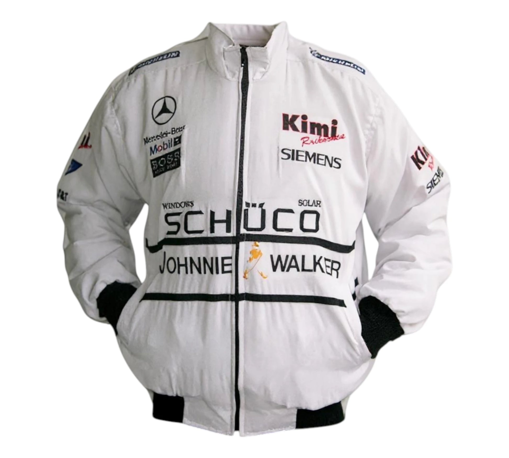 The Mercedes Benz Kimi McLaren Schuco Racing Vintage Jacket features high-quality sublimation printing that captures every detail of this iconic racing design. Crafted for enthusiasts and collectors, this jacket combines vintage style with modern durability, making it perfect for showcasing your passion for motorsport. Its authentic look pays tribute to Kimi Räikkönen’s legendary racing career, while the comfortable fit ensures it can be worn both on and off the track. Ideal for fans seeking a unique piece of racing history with lasting appeal.