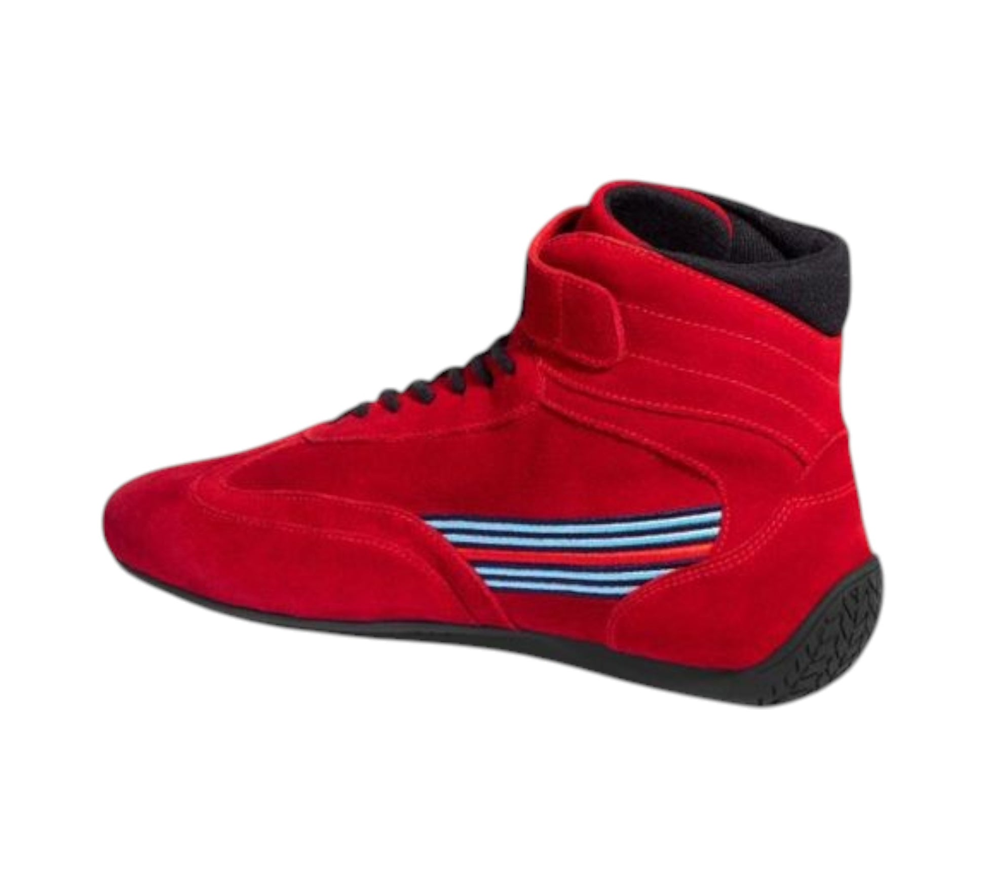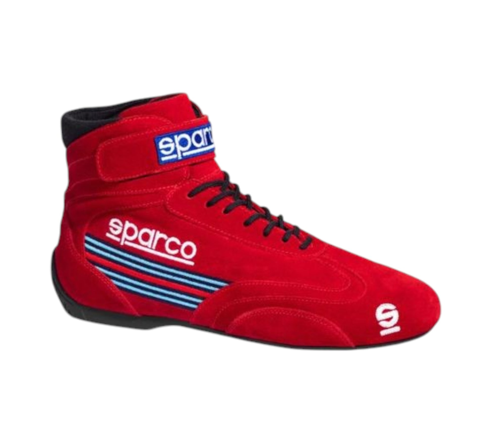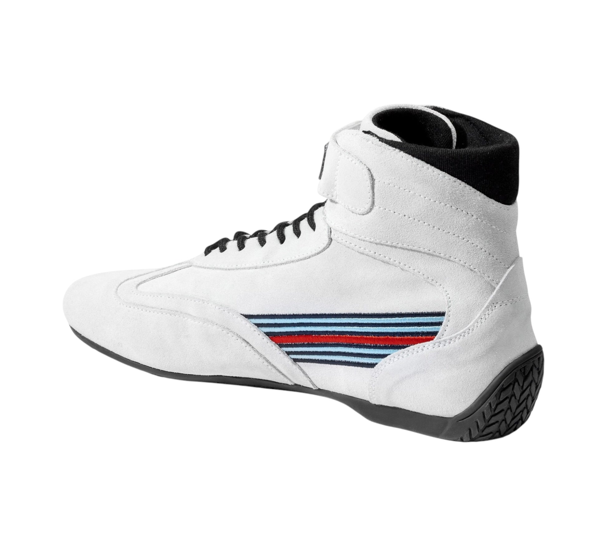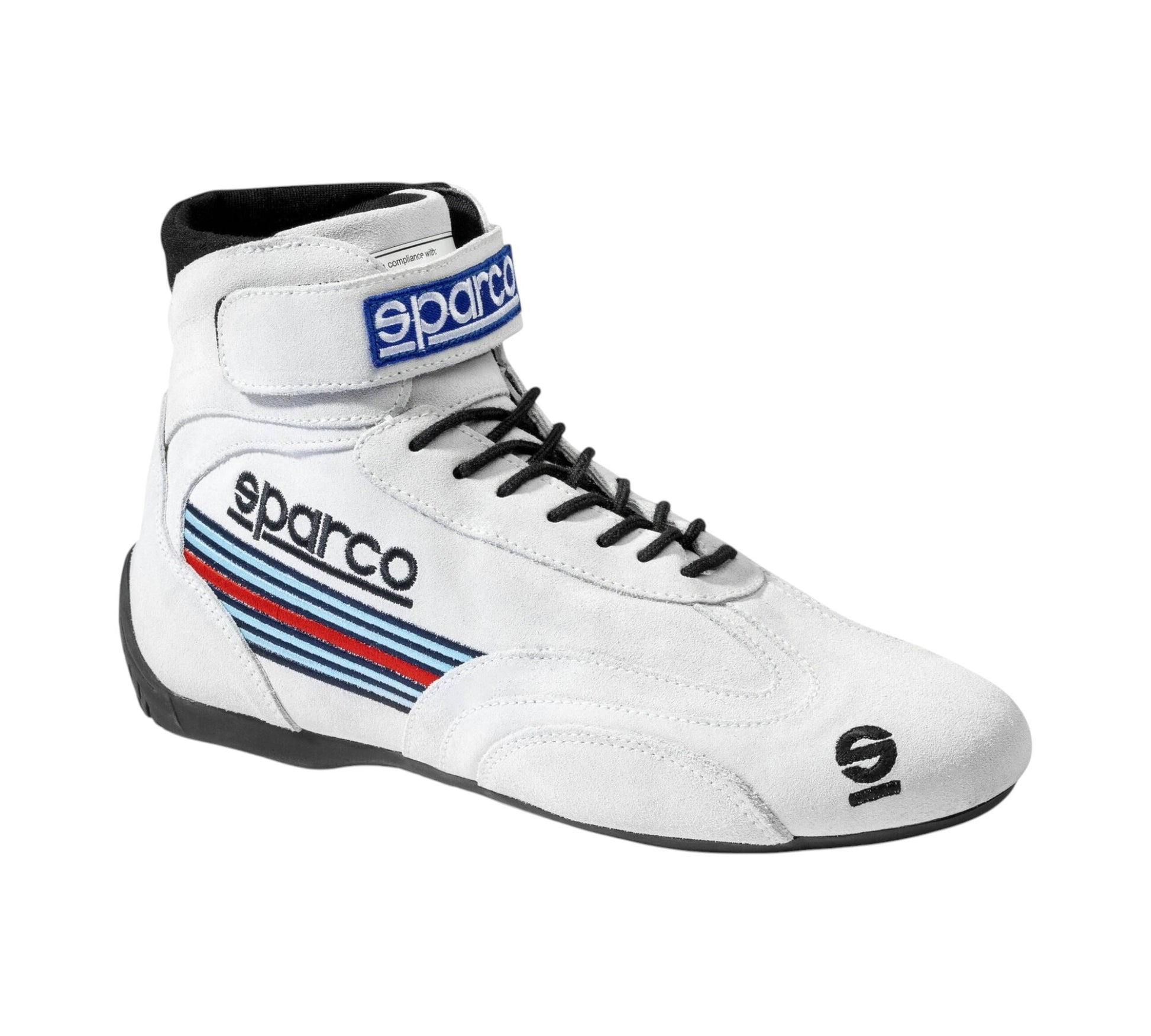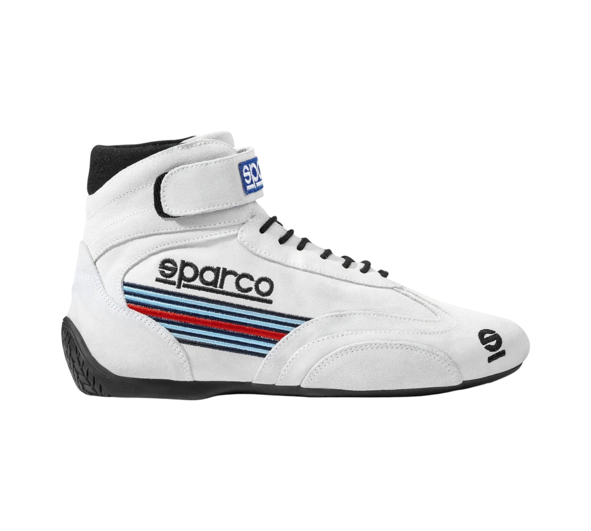 Martini racing top race boots from Sparco are use in Motorsport and feature iconic Martini racing stripes on the sides. The boots are part of a complete Martini racing themed racewear set which includes a race suit, gloves and helmets enabling a complete look.