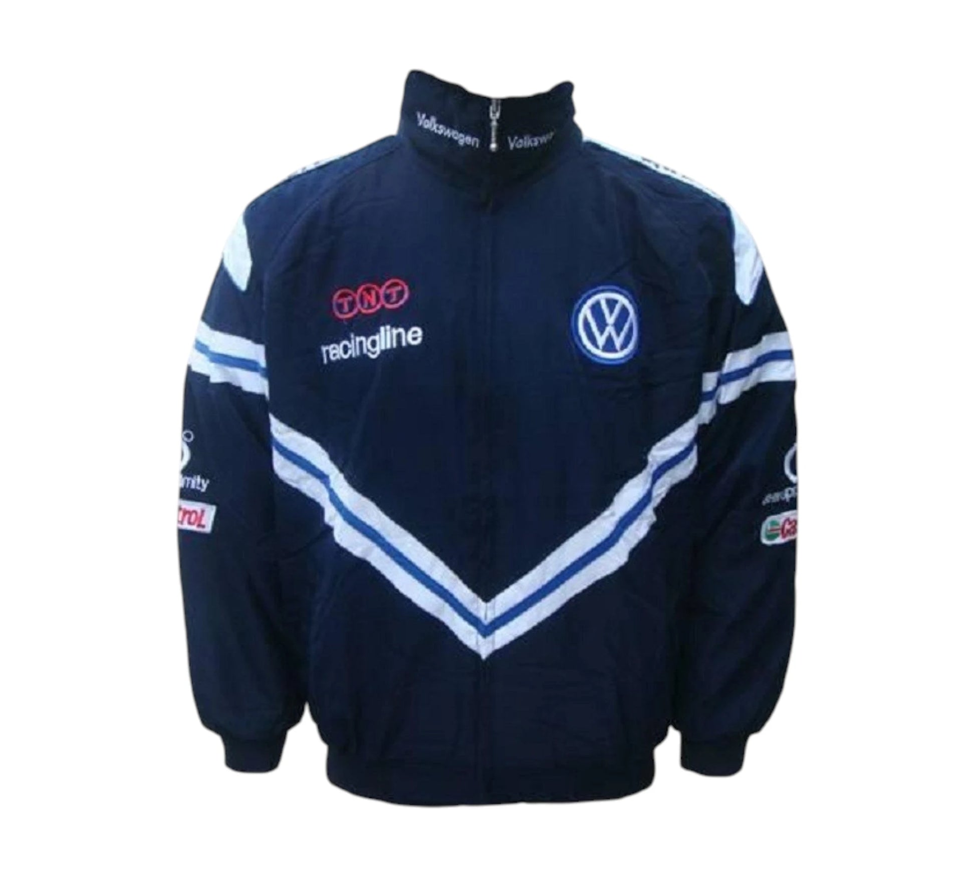 The VW Volkswagen Racing Line Racing Jacket in Navy Blue showcases expert sublimation printing technology, ensuring the design remains vivid and resistant to fading over time. Crafted for enthusiasts who demand both style and durability, this jacket offers a sleek racing-inspired look while providing comfortable wear. Ideal for motorsport fans, it combines performance aesthetics with long-lasting quality.